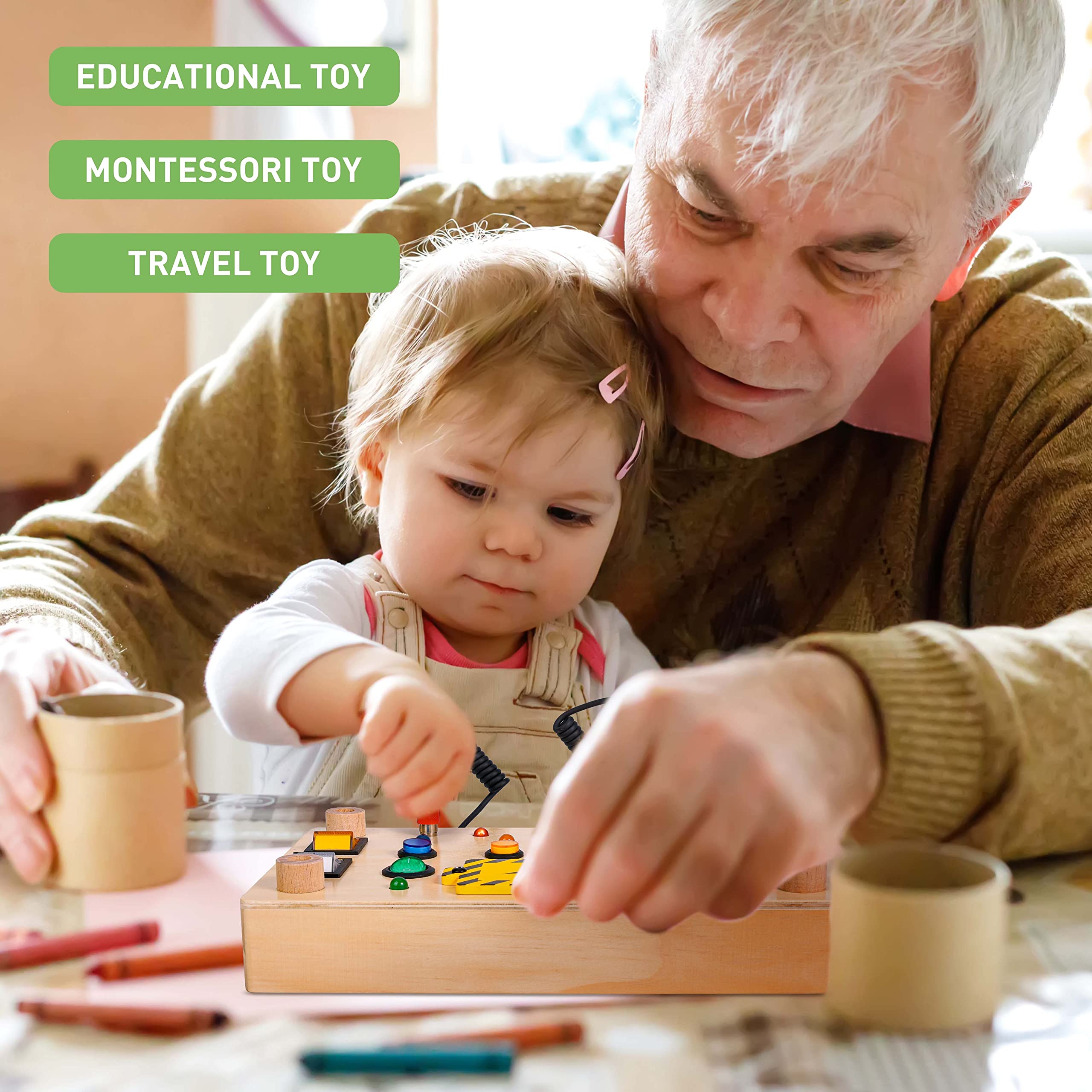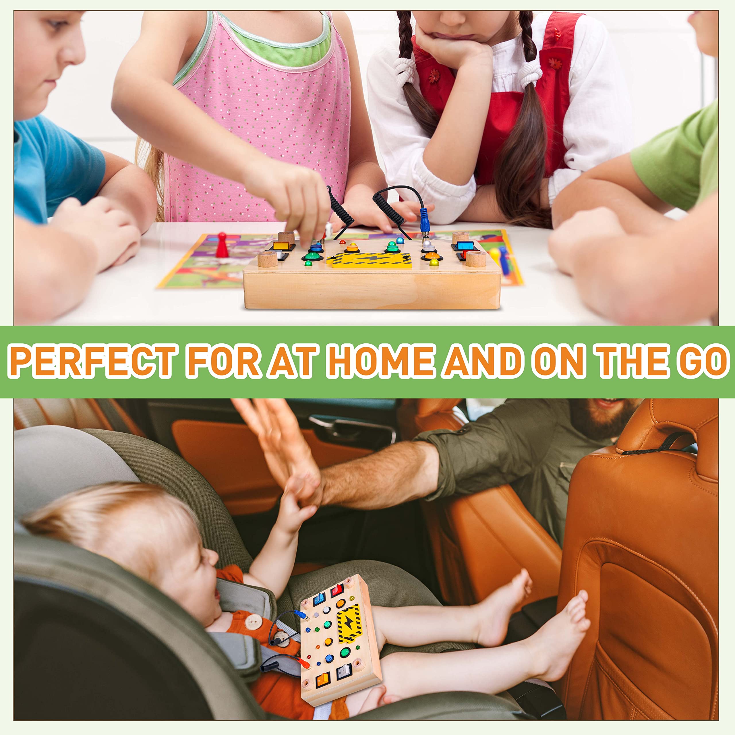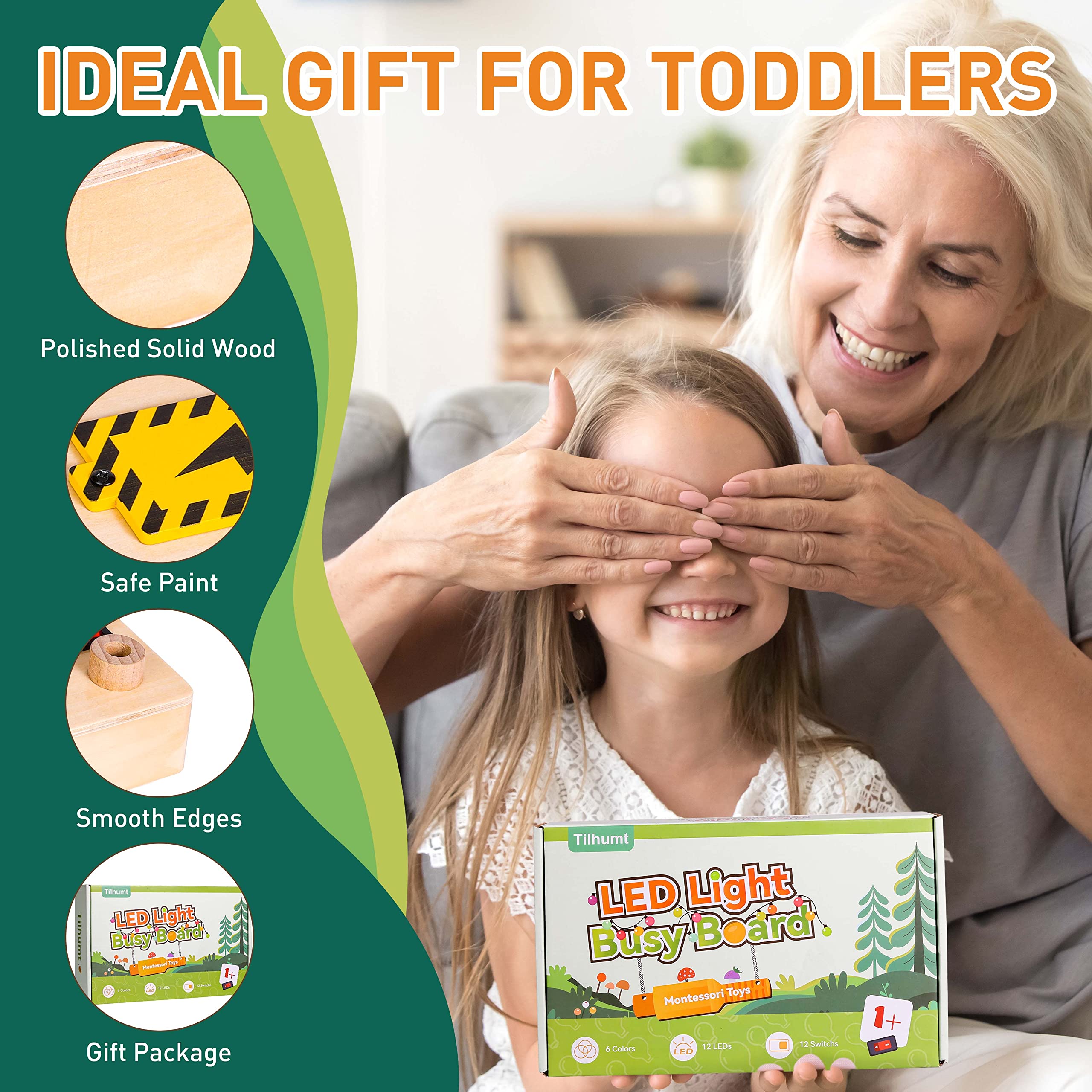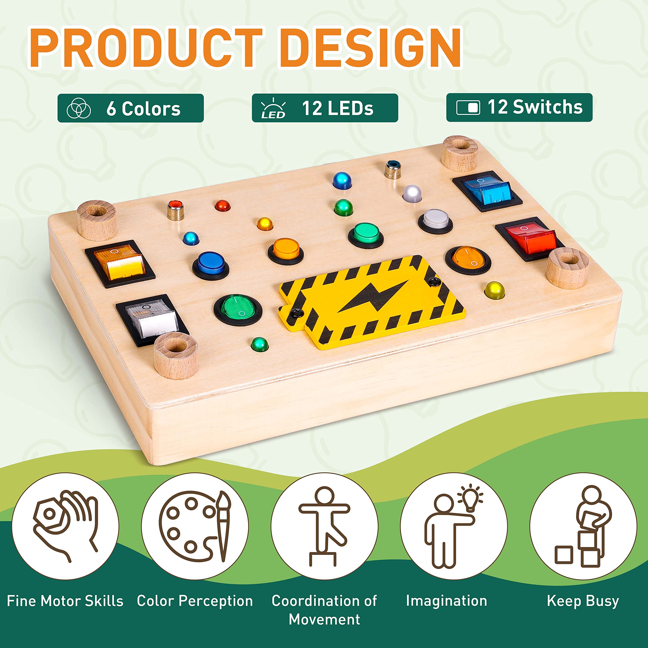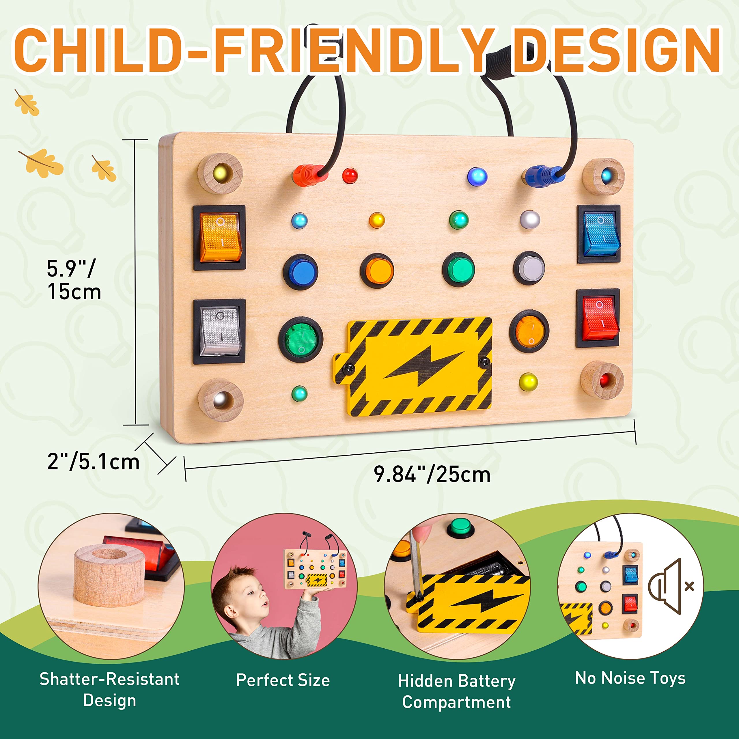 Multiple Features: The light switch toy has 12 6-color lamp beads and 12 4-type switches. Multiple types and colors of buttons can improve children's Color perception and hands-on skills. Tilhumt aims to turn the boring learning process into a creative and fun game@Perfect Travel Partner: About 9.8 x 5.9 x 2 inch, suitable for the kids' little hands and easy to carry around. It will keep your little one busy while traveling, away from mobilephone addiction. Noise-free allow parents to enjoy temporary tranquility@Keep Children Safe: Made of polished solid wood, smooth edges and surface. Hidden battery case ensures that the battery does not fall(needs two AA Batteries, not included), which is very safe for your toddlers. Four corner protruding pillars make the busy lamp and switch not easily damage when falling, extend the life of the toy@Educational Toys: This activity board is suitable as sensory toys and preschool toys for your toddlers 1-3 years. It develops intellectual, hands-on, interest training, sensory, hand-eye coordination, develop their fine motor skills and problem-solving skills@Great Gift Choice: A wonderful present choice for birthday, Easter, Christmas, family gatherings and Children's Day for 1-3 years old toddlers, suprise your kids with this light fidget busy board toy. Your children will be entertained for hours with buttons, wires and light combinations***If you have any questions, please email us, we will response within 24 hours
