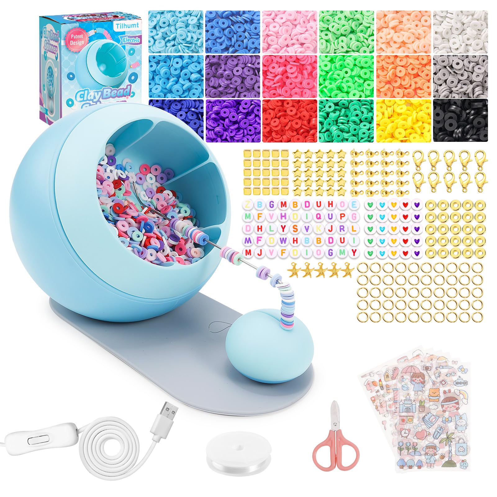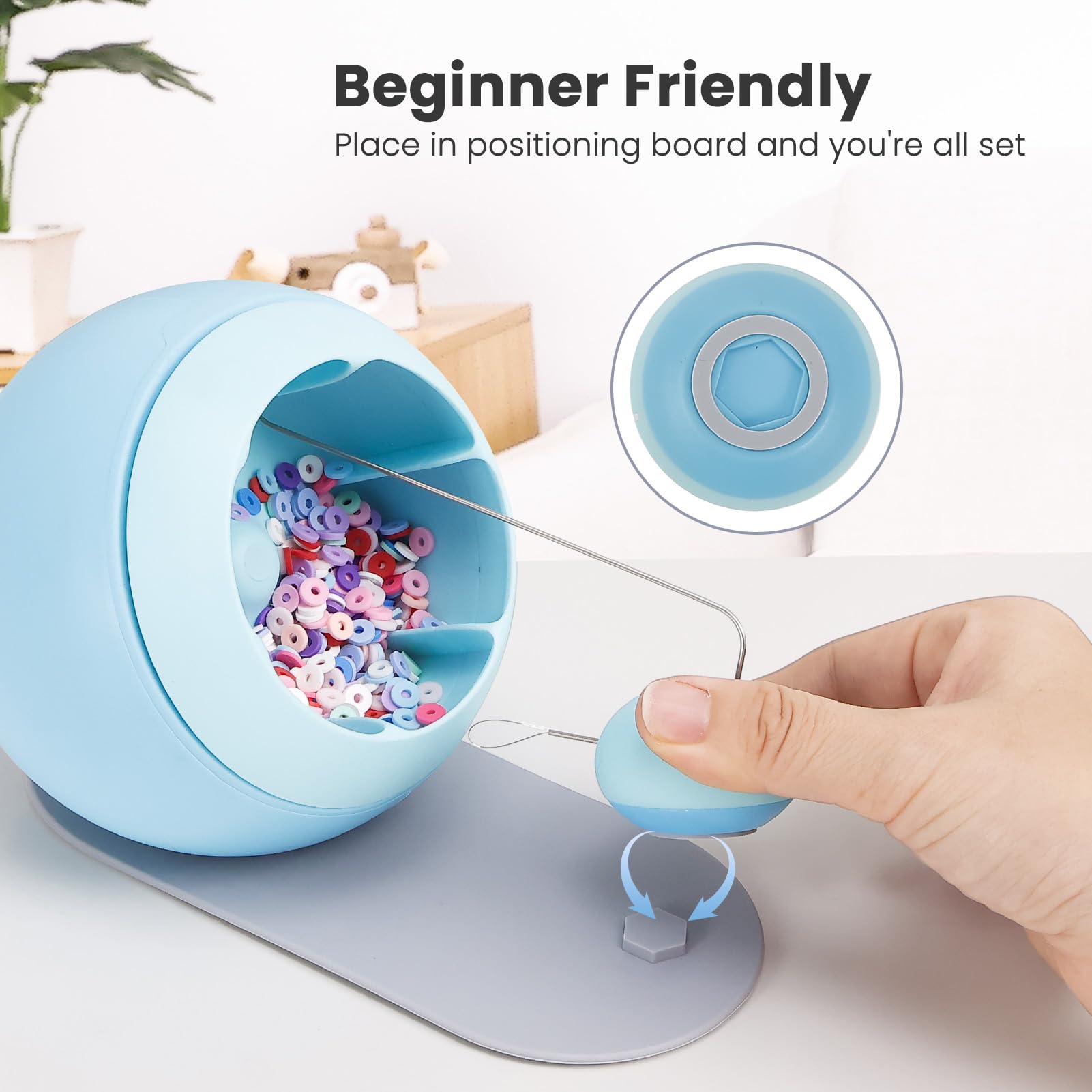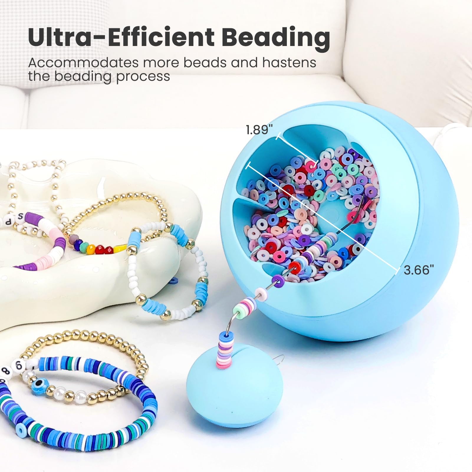 Extra-Large Bead Bowl, Holds More: This upgraded electric bead spinner features a unique spherical design with a larger inner bowl that holds more beads at once—reducing spills and increasing efficiency by up to 70% compared to manual beading. It allows you to string up to 6 inches of beads in just 30 seconds, making your jewelry-making faster and more enjoyable.@Built-In Positioning Mat: Designed with ease of use in mind, this bead spinner kit comes with a positioning mat that ensures your machine and needle base are always aligned correctly. Just place them on the mat, turn it on, and start stringing. Perfect for beginners, hobbyists, and even small business owners—no complicated setup or learning required.@Fast Beading Performance: Say goodbye to slow, manual stringing. This Bracelet spinner significantly boosts your productivity, especially on larger projects. It's designed to spin smoothly and feed beads efficiently onto the needle, so you can enjoy crafting more and struggling less.@3600+ Beads & Accessories Included: Everything you need is in the box: 1 clay electric bead spinner machine, 2 big eye needles, 1 thread roll, 1 needle base, and a full set of accessories—3600 clay beads in 18 colors, 50 letter beads, 10 pendants, 5 white shells, 25 gold stars, 25 square metal beads, 25 flat metal beads, 20 gold clasps, 50 jump rings, 10 lobster clasps, and 1 mini scissor.@Great Gift for Jewelry Lovers: Make your bead spinner your own with fun stickers and personalized decorations. It’s a great way to add personality to your crafting tools, and an even better gift for anyone who loves DIY. Ideal for birthdays, Christmas, Mother’s Day, or creative time with family.