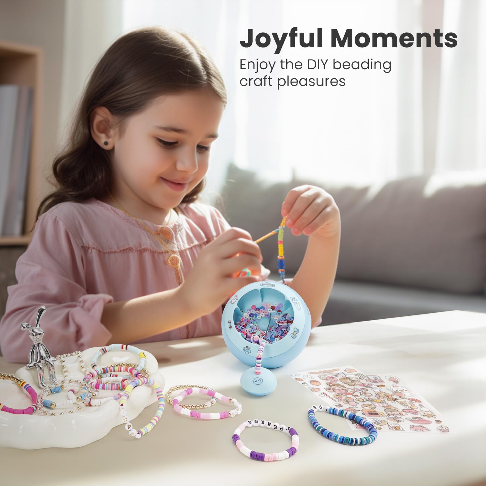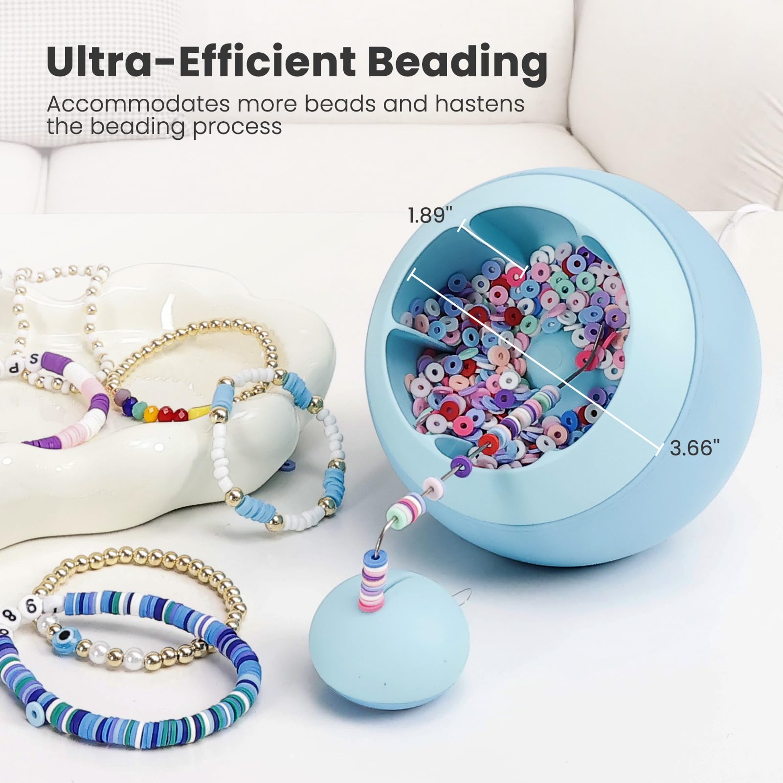 【Enhanced Beading Efficiency】 Our new patent-designed clay bead spinner, with its spherical appearance and enlarged interior space, delivers a 80% increase in beading productivity than handmade. Its innovative appearance and constructure design can contain a larger number of beads without any spillage, making it a superior tool for clay bead art lovers.@【Personalized Bead Spinner】 Want a bead spinner that reflects your style? The spacious bowl allows you to personalize the machine with your favorite stickers, creating a unique bracelet spinner. This electric bowl spinner makes the beading process fun and exciting, allowing DIY beginners to enjoy beading and offering a captivating experience for bead lovers.@【Easy-to-Use】 The package comes with a positioning board. Just place the machine and the needle base in the appropriate position, and you're ready to start. No need for extensive learning - let the machine do the beading for you. You can also improve your beading skills with the help of the included instructions or videos.@【Straightforward Operation】 1. Pour 1/3 of the clay beads into the bowl 2. Thread the string and secure the needle in the groove of the beading needle holder 3. Place them on the positioning board and switch on the machine. You can add more beads for higher efficiency, but remove some if they start to spill to keep balance.@【Comprehensive 3847Pcs Jewelry Making Kit】 The clay bead spinner kit includes 1x clay bead spinner, 1x thread, 6x stickers, 1x positioning board, 2x needles, 1x needle base, 3600x clay beads in 18 colors, 50x letter beads, 25x heart beads, 5x starfish pendants, 25x star beads, 25x square beads, 25 flat beads, 20 clamshell bead, 10 lobster clasps, 50 jump rings and 1x small scissor.