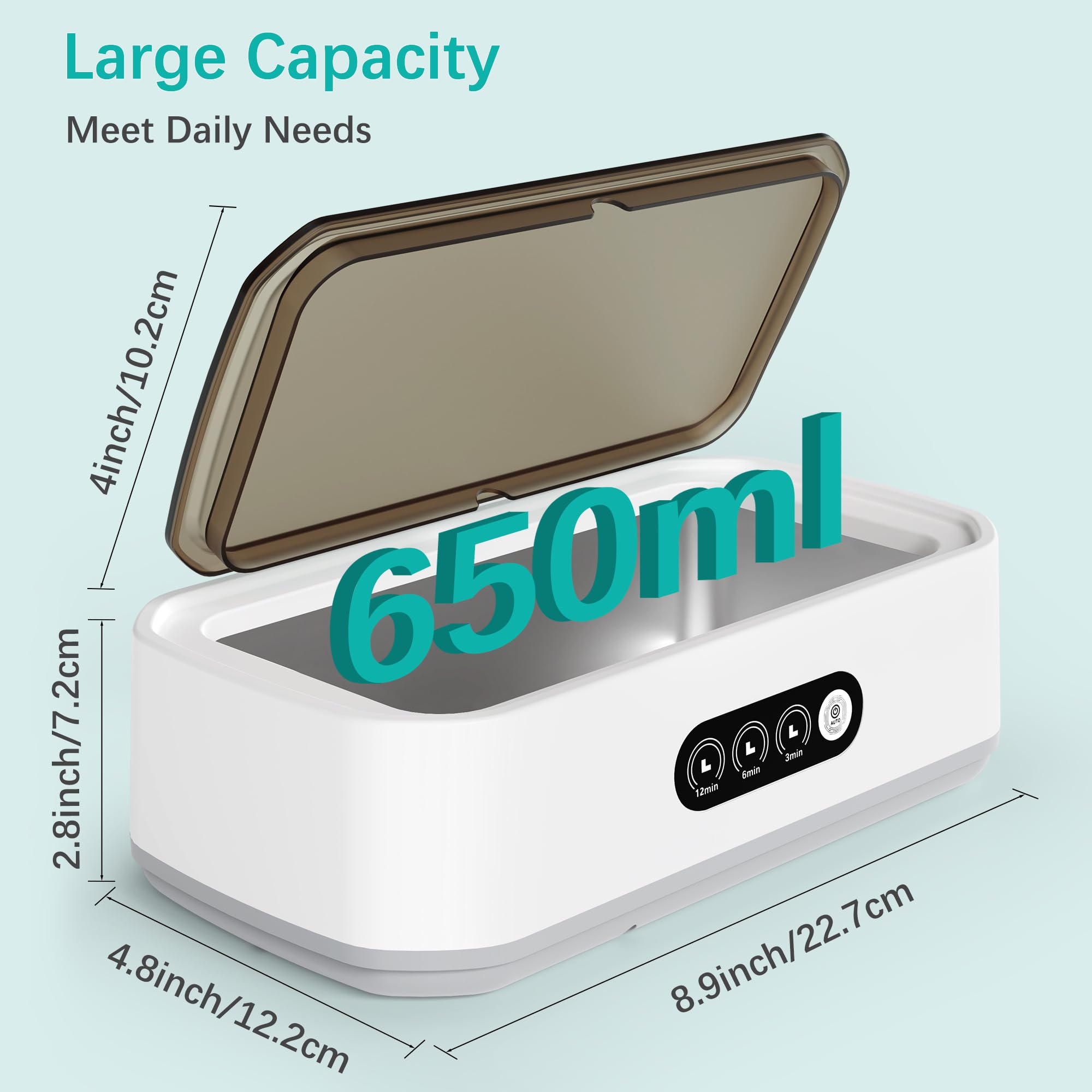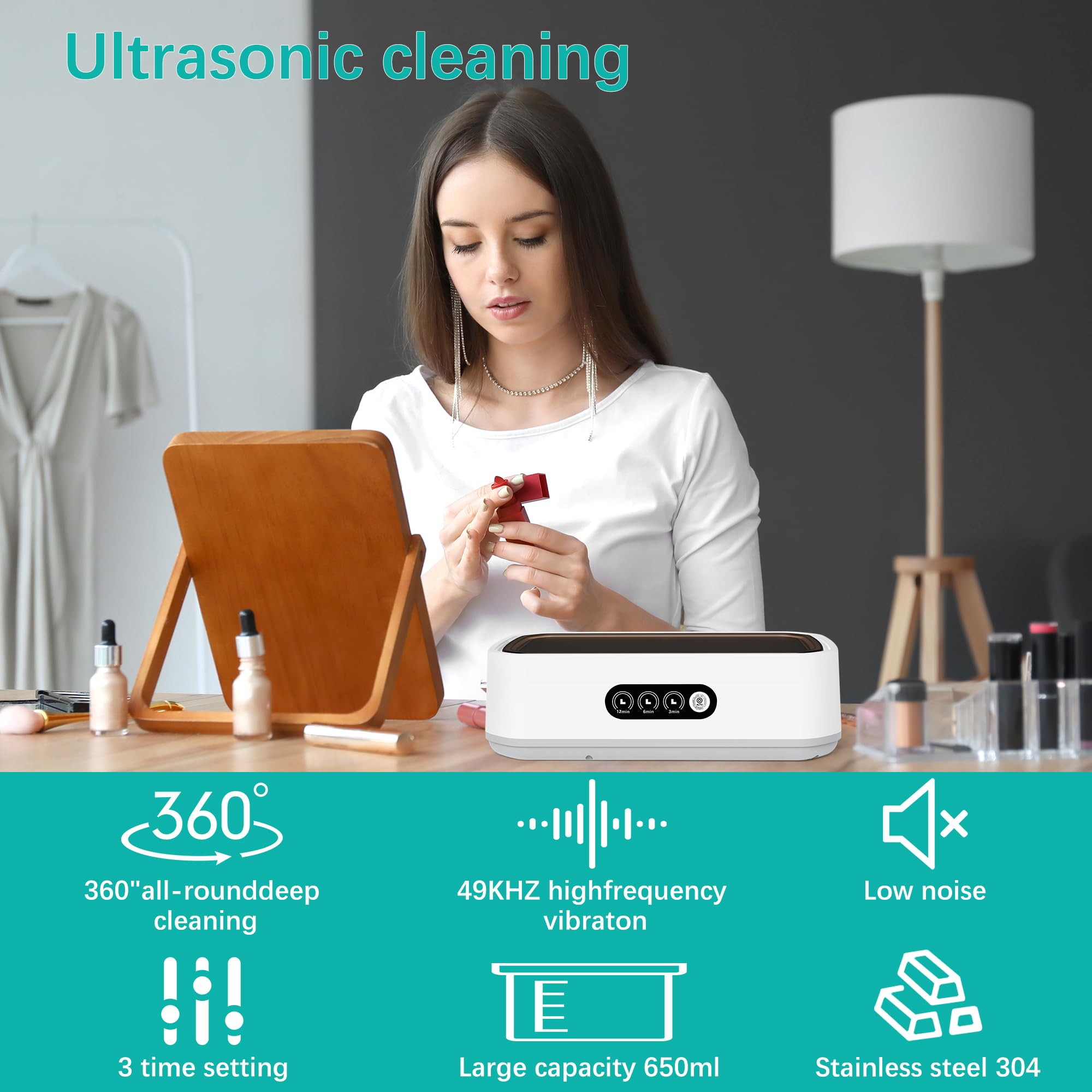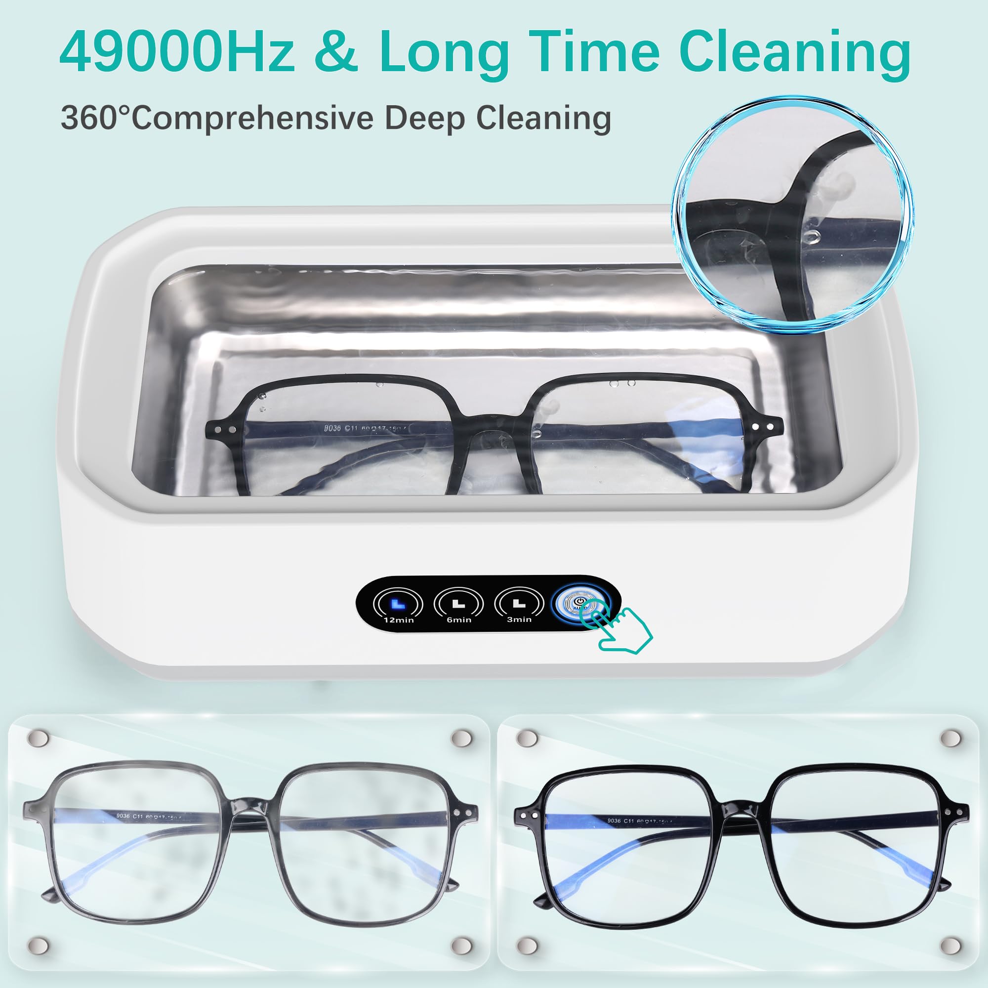 Hochfrequenzreinigung: Der Ultraschall-Schmuckreiniger erzielt makellose Ergebnisse mit 49kHz Ultraschallwellen, die Mikroblasen erzeugen für eine kraftvolle, aber sanfte 360°-Reinigung, ideal zum Wiederherstellen des Glanzes Ihrer Wertsachen.@Langlebiges und umweltfreundliches Design: Der Ultraschall-Zahnspangenreiniger aus 304 Edelstahl und ABS-Kunststoff ist langlebig, bietet Korrosionsbeständigkeit und eine robuste Struktur für den langfristigen Gebrauch.@Vielseitige Reinigungsmodi: Der Ultraschall-Brillenreiniger bietet die Wahl zwischen 3-, 6- oder 12-Minuten-Zyklen mit einem einfachen Knopfdruck. Die Ein-Klick-Bedienung sorgt jedes Mal für eine mühelose Bedienung und effiziente Reinigung.@Geräumige 650ML Kapazität: Der Ultraschall-Schmuckreiniger fasst eine Vielzahl von Gegenständen, von Schmuck und Brillen bis hin zu Zahnprothesen, und ist ideal für den persönlichen und häuslichen Reinigungsbedarf.@Tragbar und praktisch: Leicht und kompakt, ist dieser Ultraschallreiniger perfekt für den Einsatz zu Hause, im Büro oder auf Reisen. Er ist auch ein durchdachtes Geschenk für jeden, der effektive Reinigungslösungen schätzt.