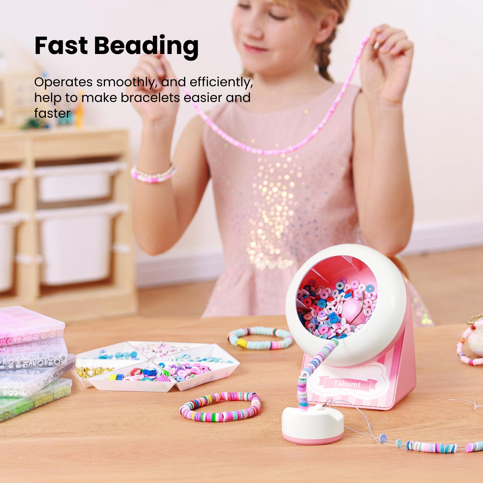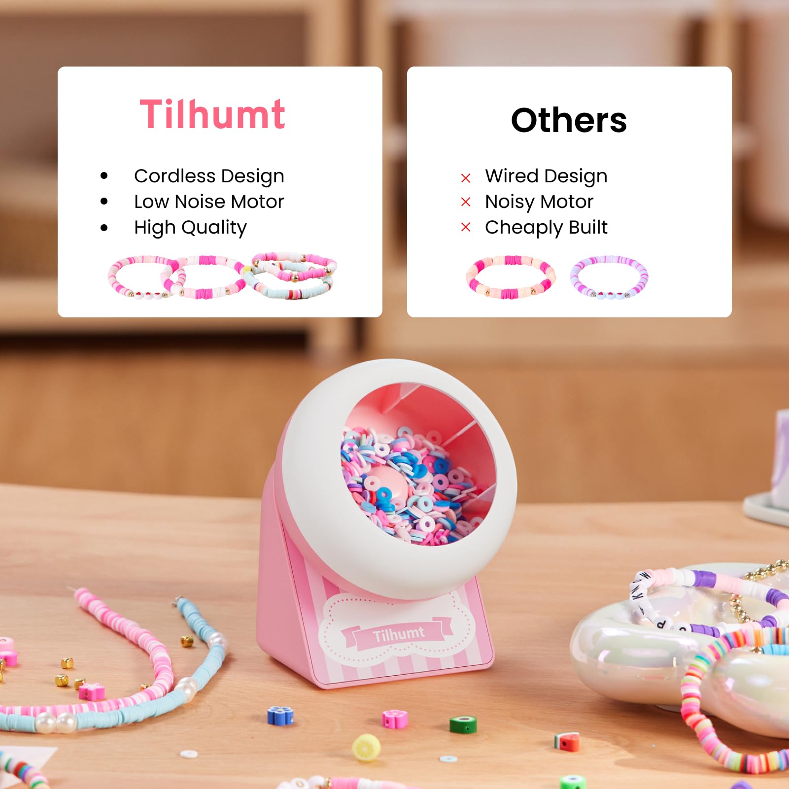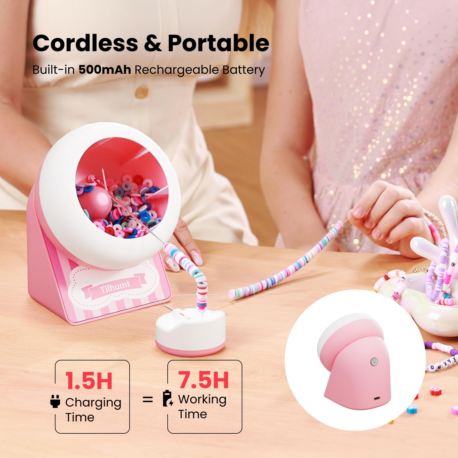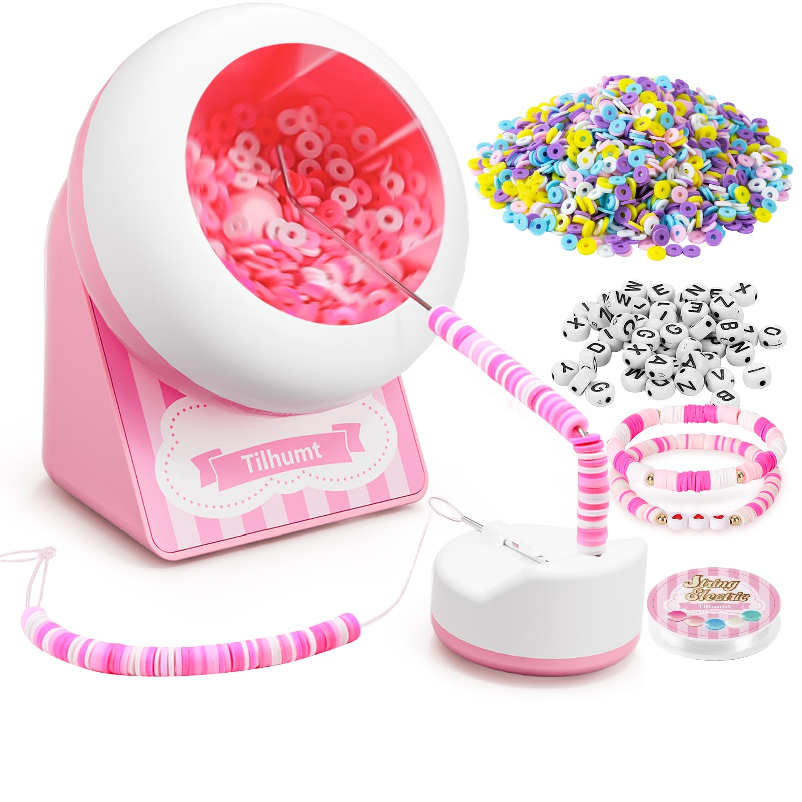 Cordless Design: Say goodbye to cumbersome power cables. Equipped with a 500mAh lithium battery, this electric bead spinner offers up to 7.5 hours of continuous operation on a single charge. Its lightweight and compact design make it easy to carry, allowing you to take your bead-making projects anywhere, whether you're at home, in a workshop, or on the go@Creative Gift Idea: The Tilhumt cordless bead spinner is a unique gift for craft enthusiasts. It allows for the creation of beautiful jewelry making with ease, making it an ideal present for birthday, Christmas Day, and more@Easy To Operate: Fill about 1/3 of the bowl with clay beads and adjust the angle of the beading needle to find the sweet spot (slightly to the top right of the center bump). This will allow the beads to fall perfectly into place. With our bracelet spinner, you can create a stunning bracelet in just 2 minutes@Increased Efficiency: As the originators of the concept of a clay bead spinner, we have, after thousands of tests, finally succeeded in identifying the optimal rotation angle and speed of the bowl. This innovation significantly enhances the efficiency of bead-making and saves a considerable amount of time@What’s in The Box: Our package includes 1x rechargeable cordless bead spinner, 2000x clay beads, 40x letter beads, 2x beading needles, 1x needle holder, 1x elastic string, 1x type-c charging cable, 1x user manual