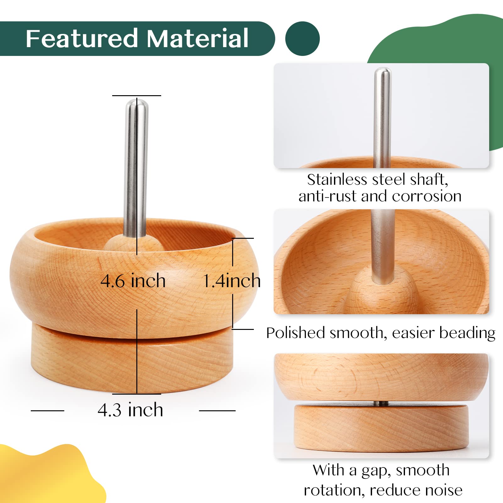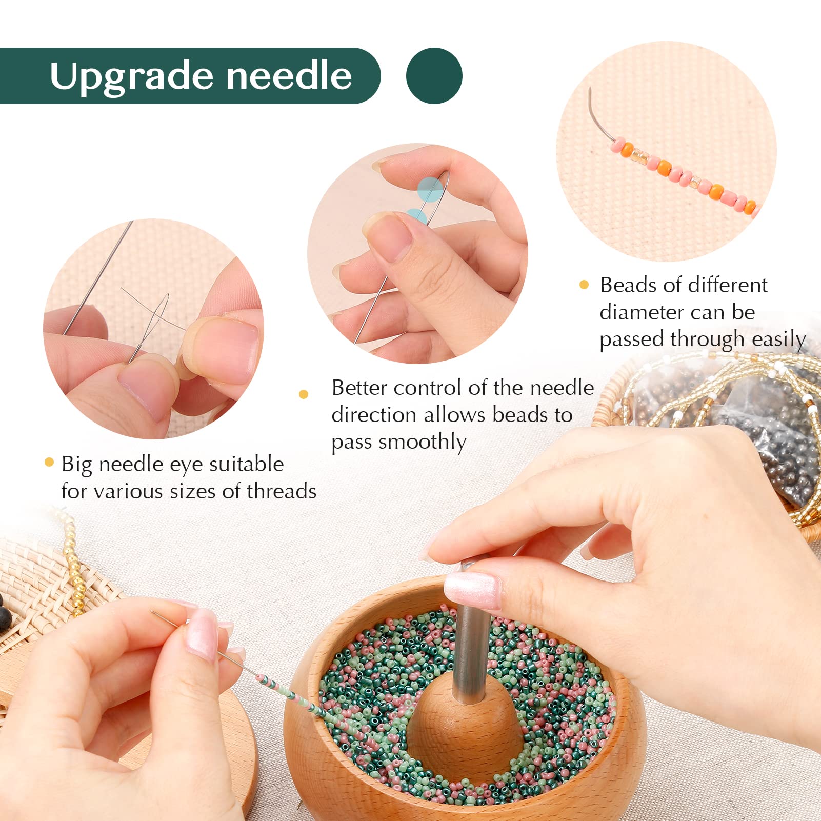 Pakage Includes: 1 x 11 cm bead spinner with a open lid, 6 x large eye beading needles, 15000 x 2 mm beads in 15 colors, 20 x lobster clasp, 50 x open jump ring, 3 x different threads. A value beading set for jewelry making and beading craft@Flexible Needle Eye: Tough and soft open needle eye can be adjusted for easy threading, resilient and not easily deformed, more convenient for next threading@Easy to Use: Fill the bowl at least 1/4 full of seed bead. Place your string on a curved beading needle. Turn the beader and angle the needle into the bowl while spinning, then the beads will "jump" onto the needle, greatly improving the efficiency of beading@Beading Bowl Spinner: Made of natural wood, polished and round. The heavy base and special structure keeps the bowl stable, rotation easier and noise-free while working. Wooden lid with opening for easy pouring of remaining beads, can reduce the waste of beads@DIY Jewelry Making: The spin and bead kit can be applied for seed beads of many materials, including glass, metal, stone, plastic and wood etc. Use your imagination to make your favorite bracelets, necklaces, waist chains and other accessories