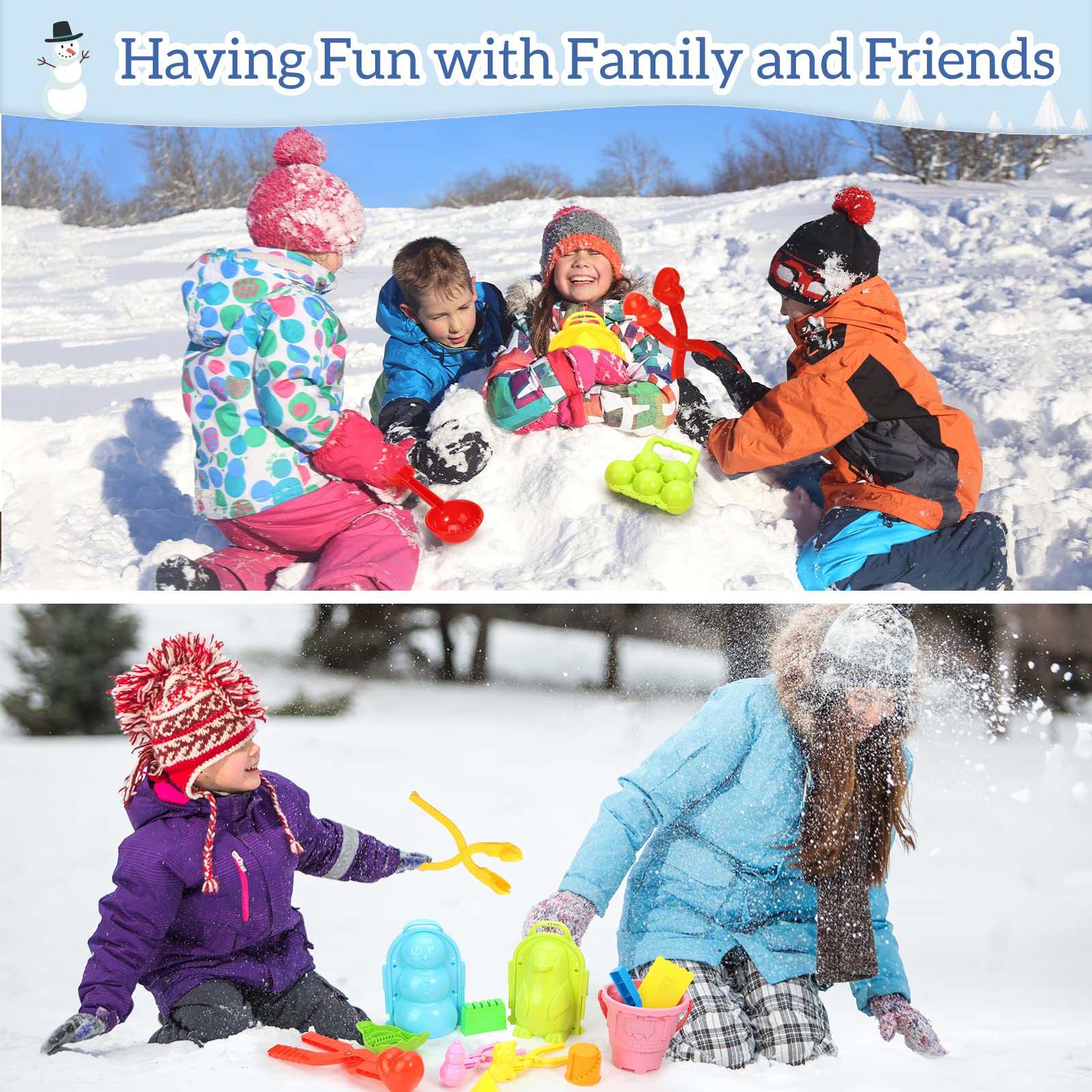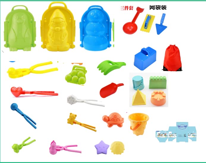 Complete Snowball Maker Kit: 3 x 8.6" snowman molds, 3 x 13.7" large snowball maker with handle, 4 x 7.6" kids snowball maker clips, 1 x 5-round snowball mold, 5 x castle molds, 1 x snow brick maker, 2 x animal snow molds, 1 x star mold, 5 x snowmaker tools, 1 x carrying drawstring bag@Creative Fun Toys: A variety of different shapes of molds and tools in one set, most of children will like it. Within seconds you can make a snowball, easy for kids to operate, at the same time keep hands clean and warm, children will enjoy the fun of playing in the snow and snowball fight@Reliable Material: Winter snowball machine are made of high quality plastic material, durable and light weight. The surface is smooth to protect children's hands from being scratched. Designed with a comfortable handle that can be easily operated, suitable for both children and adults@Wide Application: Great for use in multiple seasons. In winter, you can use it to build snowmen and have snowball fights. In the summer, it can be applied as a model toy for sand. Suitable for snow, beach, patio, pool and other outdoor places. You can take them anywhere with the included drawstring bag@Ideal Gifts: This snowball maker tools kit is the most wanted gift for kids in winter, suitable for Christmas, birthday, and any holiday. Use it to play with your child can enhance the bond between parents and children. It is also a good helper to develop children's hands-on skills