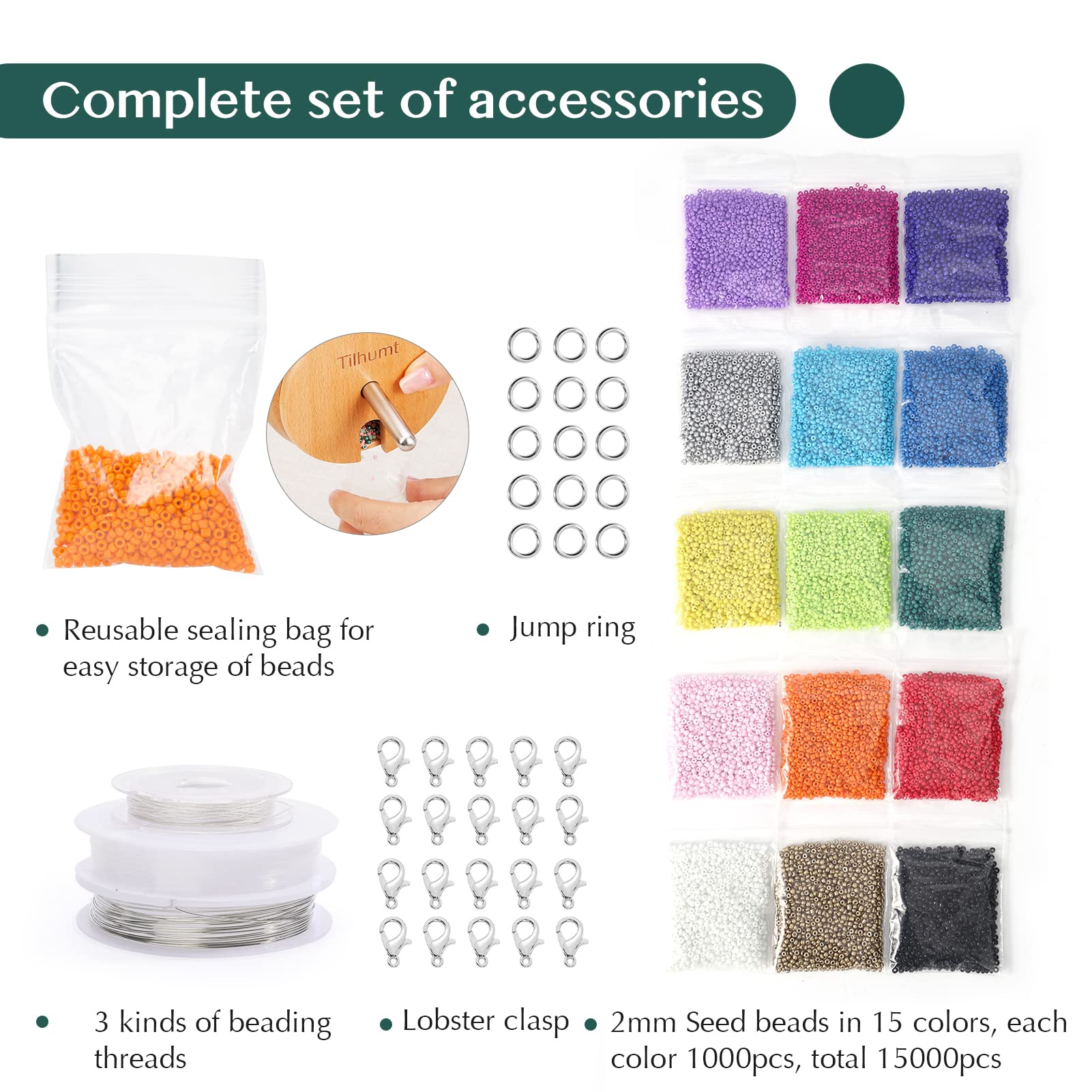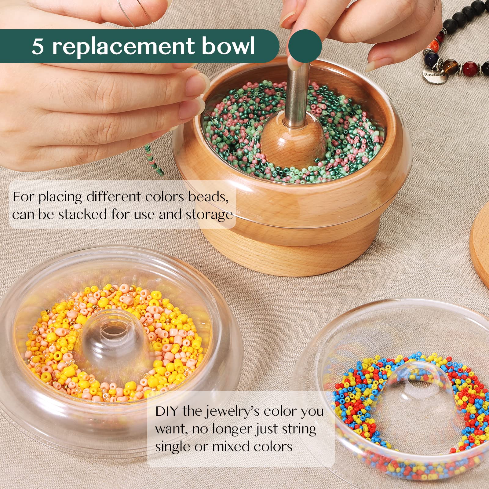 Spin and Bead Kit: 1 x 11 cm beading spinner with lid, 5 x quick changed bowls, 4 x large eye beading needles, 15000 x 2 mm beads in 15 colors, 20 x lobster clasp, 50 x open jump ring, 3 x different threads. A value beading set for jewelry making and beading craft@Flexible Needle Eye: Tough and soft open needle eye can be adjusted for easy threading, resilient and not easily deformed, more convenient for next threading@Quick Change Bowls: Comes with 5 replacement plastic bowls to use over the wooden spinner, can be filled with different colors, will not mix the colors of the beads together, allowing you to make crafts in the colors you want, no longer just string single color or mixed color@Beading Bowl Spinner: Made of natural wood, polished and round. The heavy base and special structure keeps the bowl stable, rotation easier and noise-free while working. Wooden lid with opening for easy pouring of remaining beads, can reduce the waste of beads@Various Applications: You can use the needle to make many kinds of DIY crafts, can be widely applied to many types and sizes of beads, including glass, metal, stone, and other material