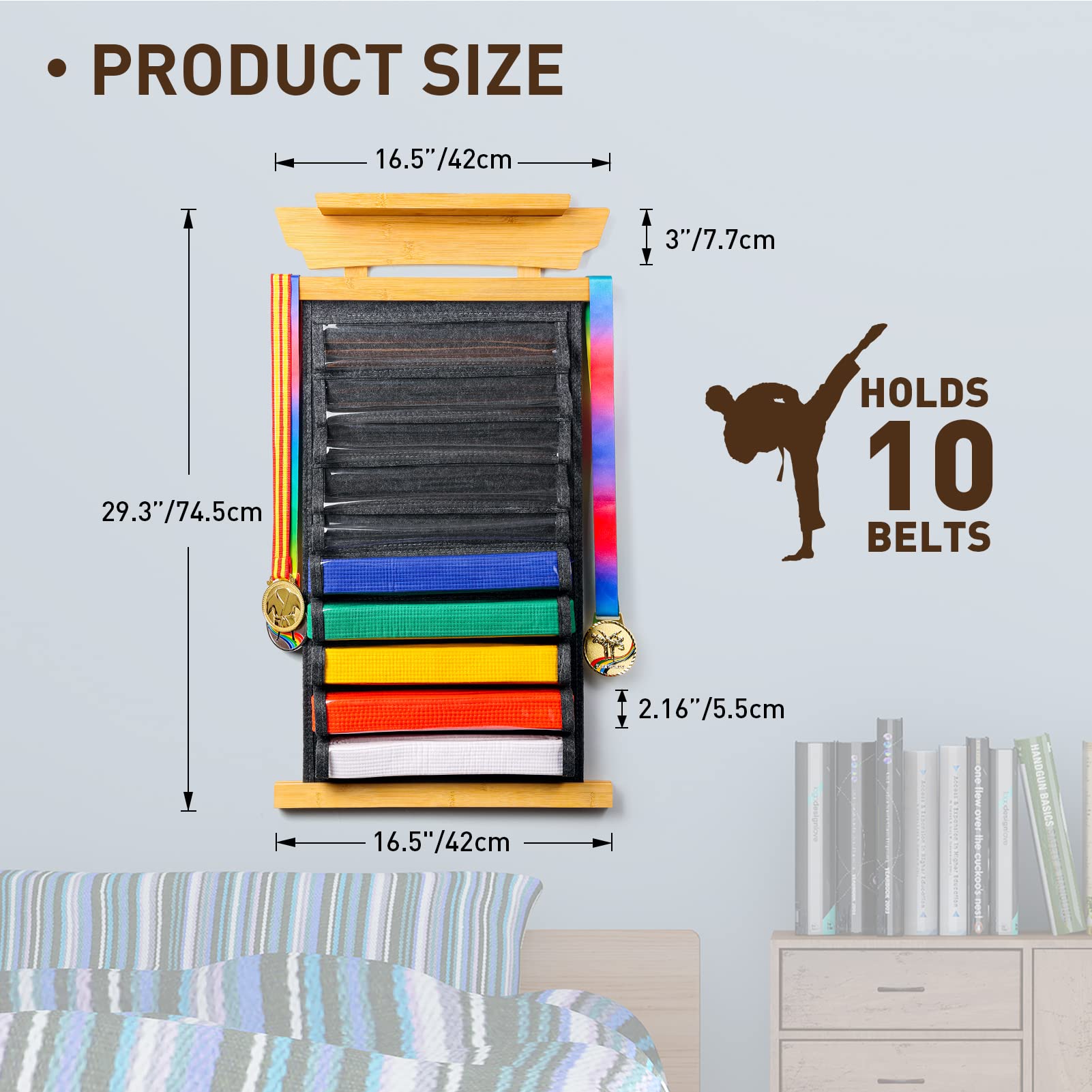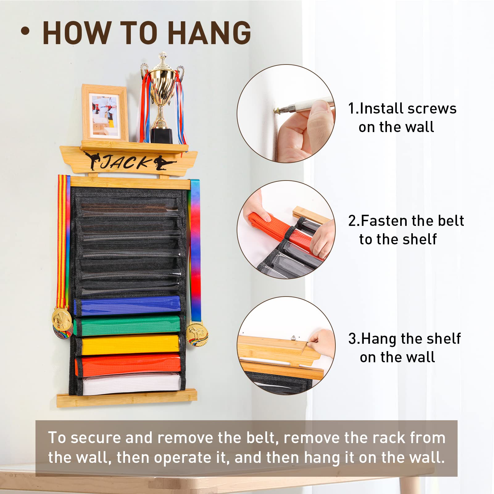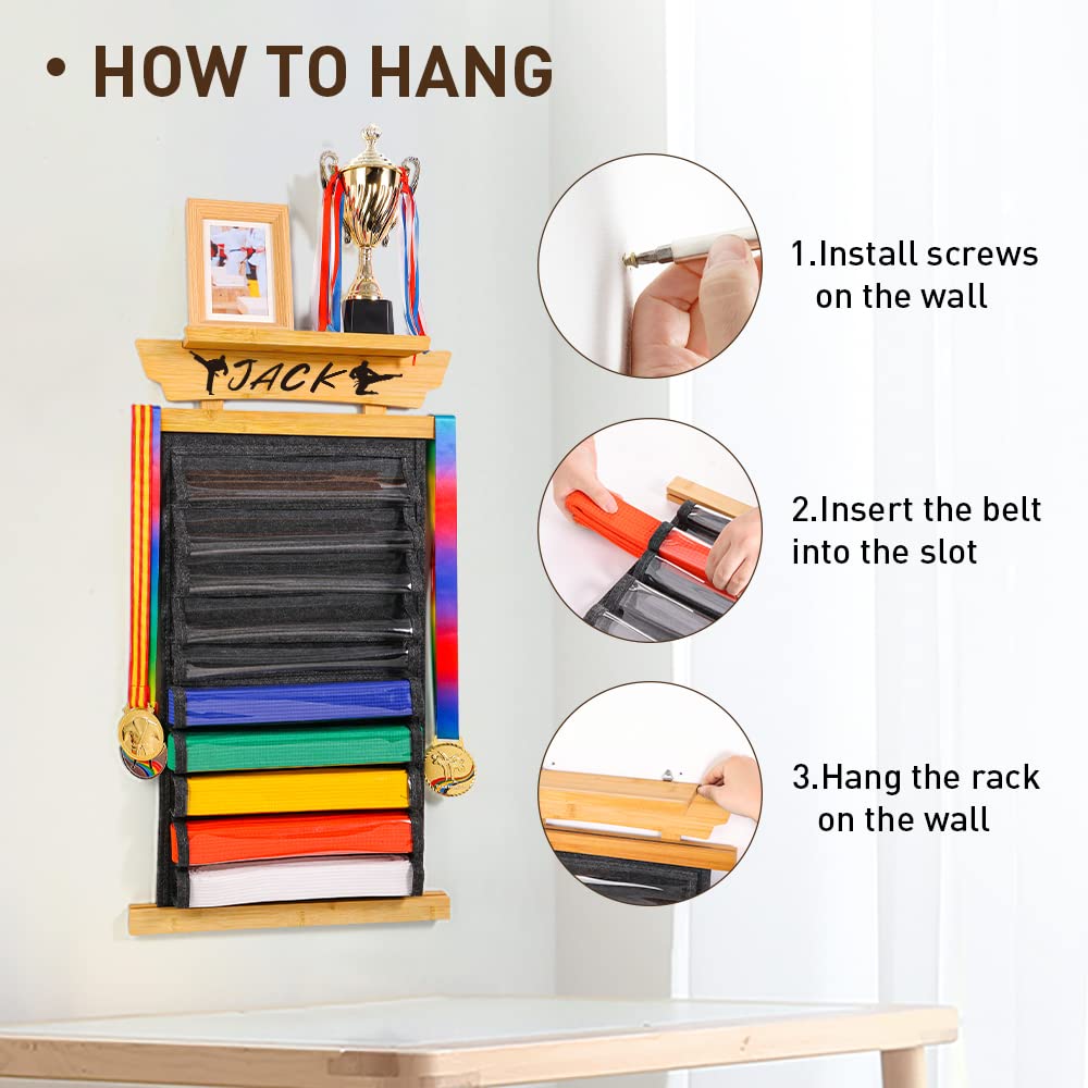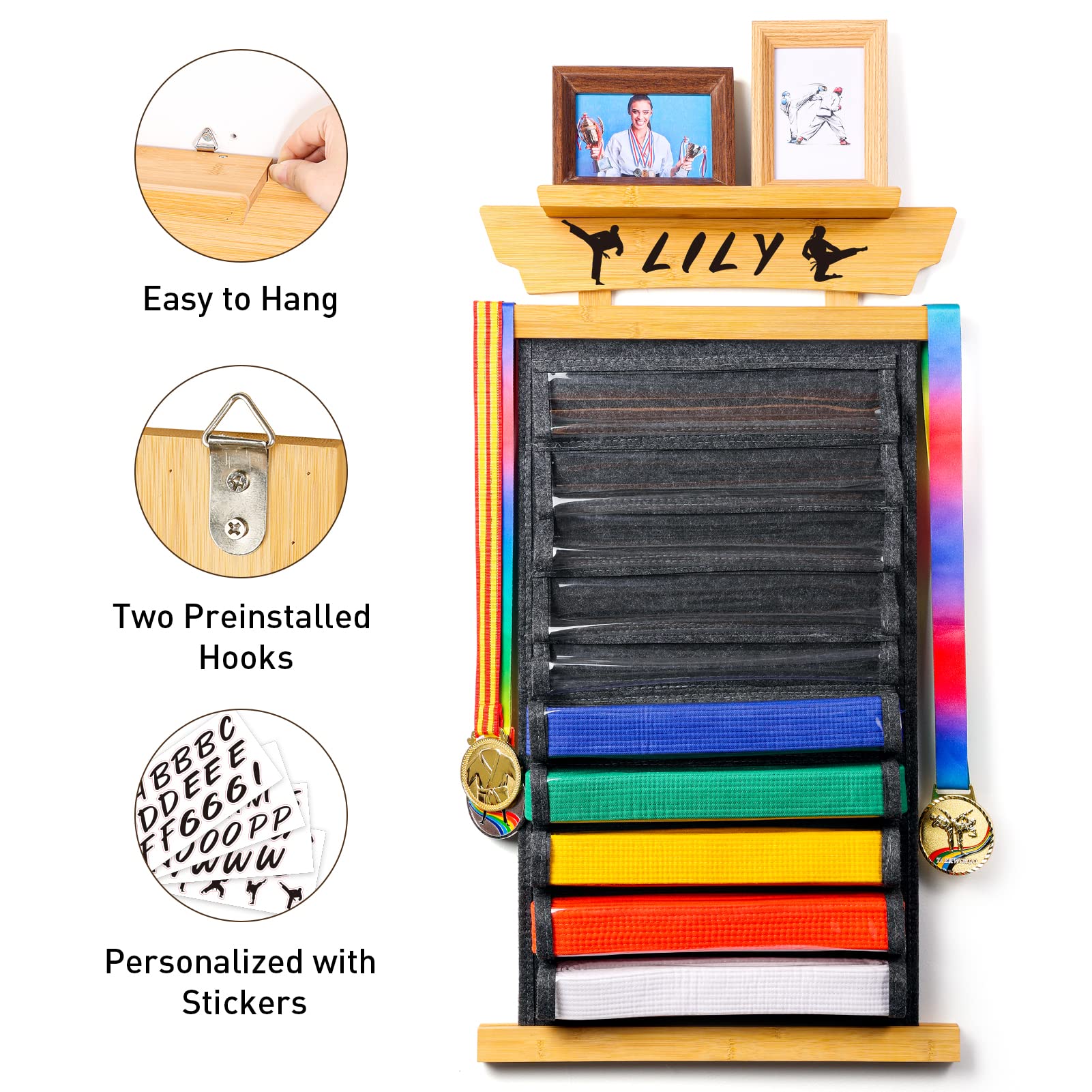 2-in-1 Display Rack: Hold up to 10 martial arts belt in the middle and a photo shelf on the top, can show your photos in the classroom or in the competition and various certificates. Suitable for learners of taekwondo, martial arts, tae kwon do, ninja, jujitsu, ninjutsu, Kung Fu, TKD, BJJ@Easy to Install and Fit Belt: Comes with hooks and screws, fix the screws on the wall and hang the rack with the 2 preinstalled triangle hooks on the top, easy to operation. And the slot is wide enough for various belts, convenient for you to put in and take out your karate belt@Personalized with Stickers: Inside are four stickers containing 26 letters and 8 different martial arts actions in human form, which can be personalized with your name and your favorite actions on the top slats, making it a personalized and customized showcase@Non-deformable & Dustproof: The top and the bottom parts are made of bamboo, the medium part is made of felt, the weight of the bamboo wood at both ends ensures that the middle felt will not deform easily. The slot is transparent plastic, which is textured and can protect belts from dust@Display Your Journey: Suitable for martial arts learners, friends, students, not only a way to celebrate their milestones but also keep them motivated. Minimalist style can be well integrated into various home styles, not only for storage, but also a good decoration